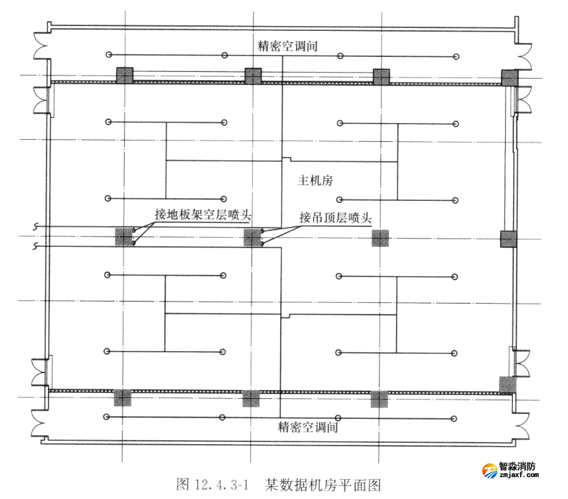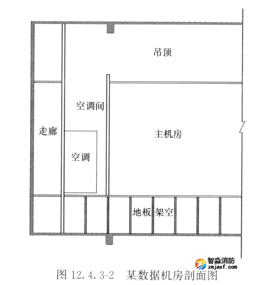 圖12.4.3-1、圖12.4.3-2所示分別為某數(shù)據(jù)機房的平面圖及剖面圖,在數(shù)據(jù)機房中經(jīng)常會遇到空調(diào)間與主機房看似分隔,而架空層和吊頂層卻是相通的情況,空調(diào)系統(tǒng)采用下送風(fēng)、上回風(fēng)的氣流組織方式,此時需將空調(diào)間和主機房視為一個防護區(qū),此防護區(qū)容積=(S空調(diào)間十S主機房)X(h吊頂層十h凈高十h架空層)。